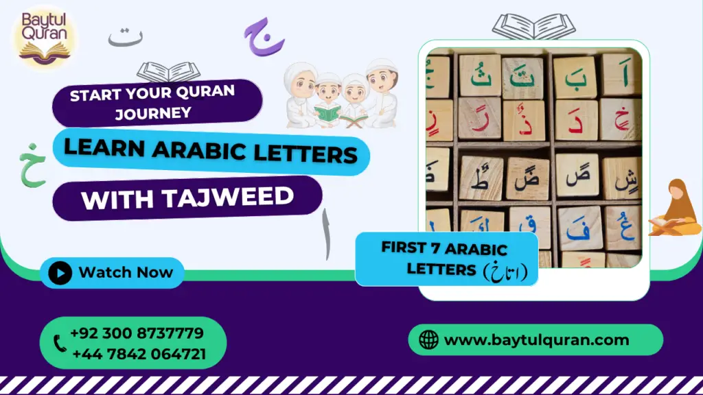 Let’s explore the first seven letters—from Alif (ا) to Khaa (خ)—with deep understanding, Quranic references, and Tajweed principles.